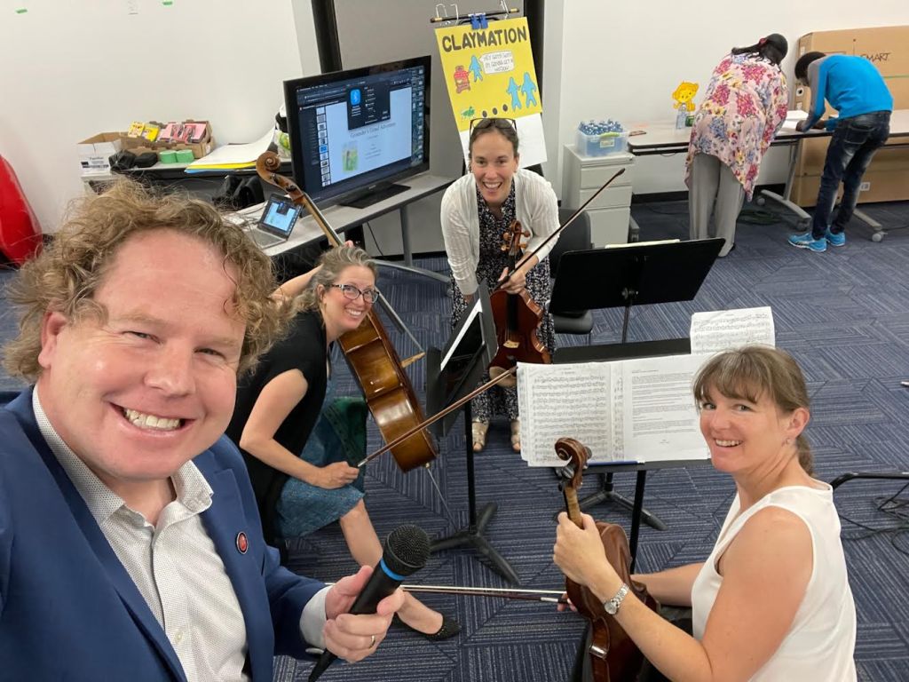 The concert runs about 50 minutes. If viruses aren’t running too rampant, we’ll have a stringed instrument discovery zoo afterwards, where audience members can take turns trying a kid-sized cello and violin or two (with the help of our performers).