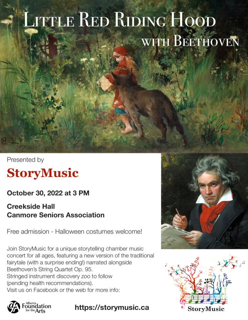 We are grateful to the good people at Canmore Seniors Centre for the use of their Creekside Hall this past weekend, as well as to our friendly audience members who came out to hear us! Special thanks go to Calgary Philharmonic violinist John Lowry, who valiantly stepped in to play the challenging Violin 1 parts at the eleventh hour when our usual player fell ill. It was a lovely crowd for a rainy Halloween weekend afternoon, and such a pleasure to premiere a live performance of Little Red Riding Hood with Beethoven. Hope to be back before long!