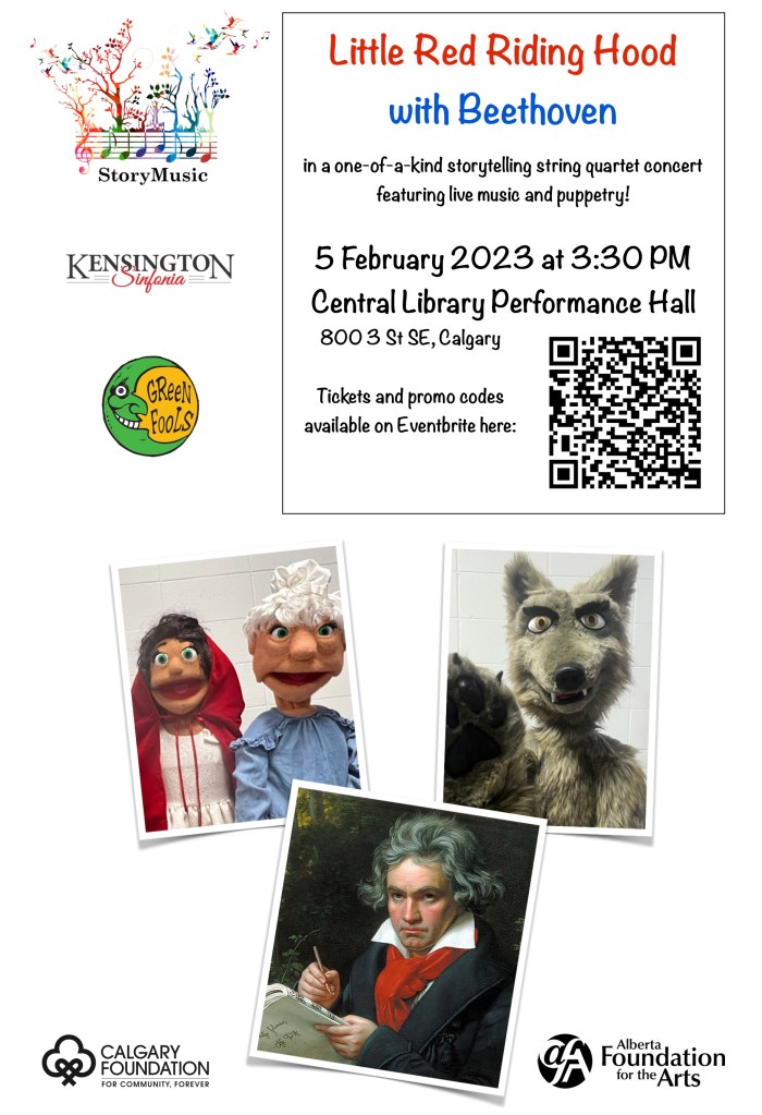 Thanks to Kensington Sinfonia’s grant from Calgary Foundation to add puppetry to my initial grant from the Alberta Foundation for the Arts, we will be able to provide a free/pay-what-you-can public concert of Little Red Riding Hood with Beethoven, with Green Fools Theatre’s amazing puppetry! Ticketing info available soon, but for now, do save the date!